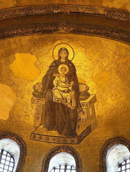 Beni mutlu etmiş olan bir diğer bir olay da arkaik dönemden itibaren Ana Tanrıçaya adanmış olan mekanımın Hiristyanlık döneminde de bu sefer Hazreti İsa’nın yanısıra annesi Meryem Ana’ya da adanmış olmasıdır. Tabii bu durumu, MS 431 yılında Efes’te toplanan Hiristyanlık konsülünün Meryem Ana’nın kutsallığını onaylamasına ve Meryem Ana’nın resmen Konstantinopolis’in koruyucu azizesi olmasına karar vermiş olmalarına borçluyum. Bir diğer deyişle, Azize Meryem Ana, artık şehrimin yeni tanrıçası (ΜΡ ΘΥ /Theotokos) olmuştur. Tıpkı şehrimin eski kader, şans ve koruyucu tanrıçası Tyche’nin betimlemeleri gibi kucağında çocuğuyla (Hz. İsa) birlikte kraliçe edasında bir tathtta oturur vaziyette, apsisimin tepesindeki yarım kubbede tasvir edilmektedir. Dönemimin mozaik sanatçıları onun ulvi kişiliğini meleklerin, azizlerin ve imparatorluk ailesinin tasvirlerinden daha yükseğe, yarım kubbeme yerleştirmişlerdir. Bu betimleme Hazreti Meryem’le birlikte bütün kadınlara verilmesi gereken saygıyı da temsil etmektedir.
