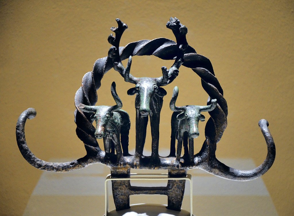 Hattian ceremonial standard known as “Sun Disks” with two bull and a deer, the sacred animals of the Hattians. The circle which forms the perimeter of the disc represents either the earth or the sun. The protrusions at the top represent fertility, and the procreation of nature. The birds symbolize fertility and the freedom in nature. These objects were used in ceremonies and rituals, and were found in the royal tombs of Hattian times unearthed in Alacahöyük, 2500-2250 BCE. Museum of Anatolian Civilizations, Ankara.